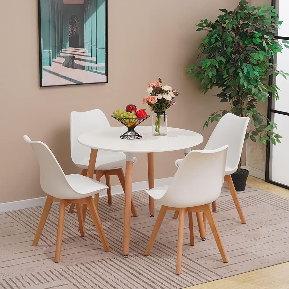 - MODERN DINING SET: This round dining table and 4 chairs set is designed to fit modern home decor requirement. White finish of table top and natural beech wood legs, full of sense of harmony. Best solution for small places need space saving, such as dining room, kitchen, office, apartment, restaurant, commerical and so on.